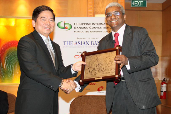 Governor Tetangco receiving the token of appreciation from Emmanuel Daniel, President and CEO of The Asian Banker. In the background is Aurelio R. Montinola III., President of Bank of the Philippine Islands. |