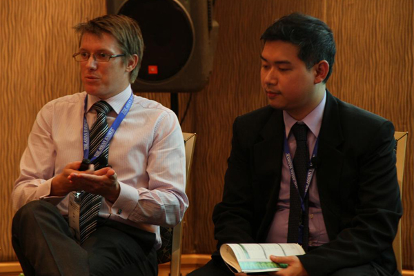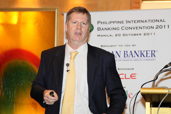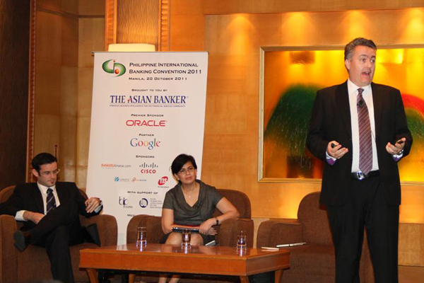 Matthew Dooley, former Head of Digital Experience, HSBC stressing on the growing importance of social media. In the background are Thomas Zink, Senior Research Analyst, The Asian Banker and Natividad N. Alejo, Senior Vice President & Group Head, Consumer Banking Group, Bank of The Philippine Islands. |