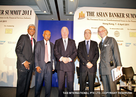 Emmanuel Daniel, President & CEO, The Asian Banker, M. Ramaswami, President, Singapore Exchange, Michael RP Smith, Chief Executive Officer, ANZ Bank, José María Roldán, Director General, Banking Regulation, Banco de España and Gordian Gaeta, International Resource Director, The Asian Banker |